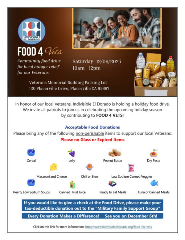 Many of the items have collected because veterans standdowns have not been able to occur this year, so additional goods from the Sacramento and Placer County veterans standdowns will be available in addition to El Dorado County items. Items not taken by veterans by noon on Sat. will be available to anyone with a donation.